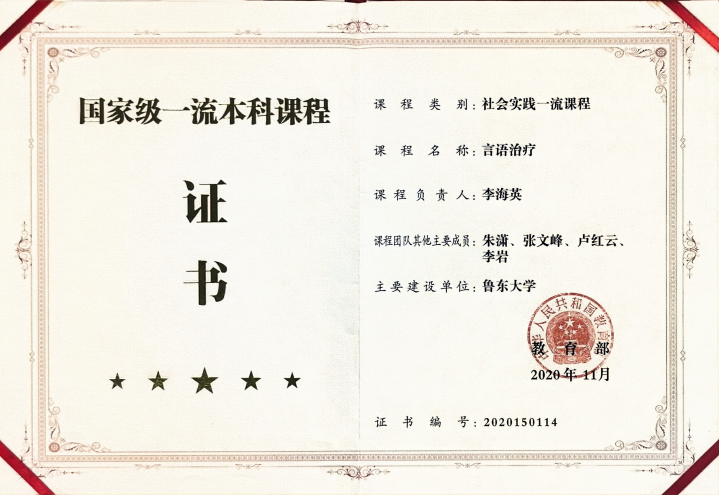 “语康中心”重点培养汉语言专业语言康复方向本科生和应用语言学专业临床语言学方向的硕士研究生。于国内中文类专业内首开《言语治疗》专业实践课,并于2021年获批首批国家级一流本科课程;其他理论与实践系列课程包括《儿童语言康复的理论与实践》《临床语言学的理论及其应用》《儿童语言康复学》等;完成山东省重点项目《新文科理念下汉语言专业语言康复人才培养实践体系构建与实施》等教改课题。