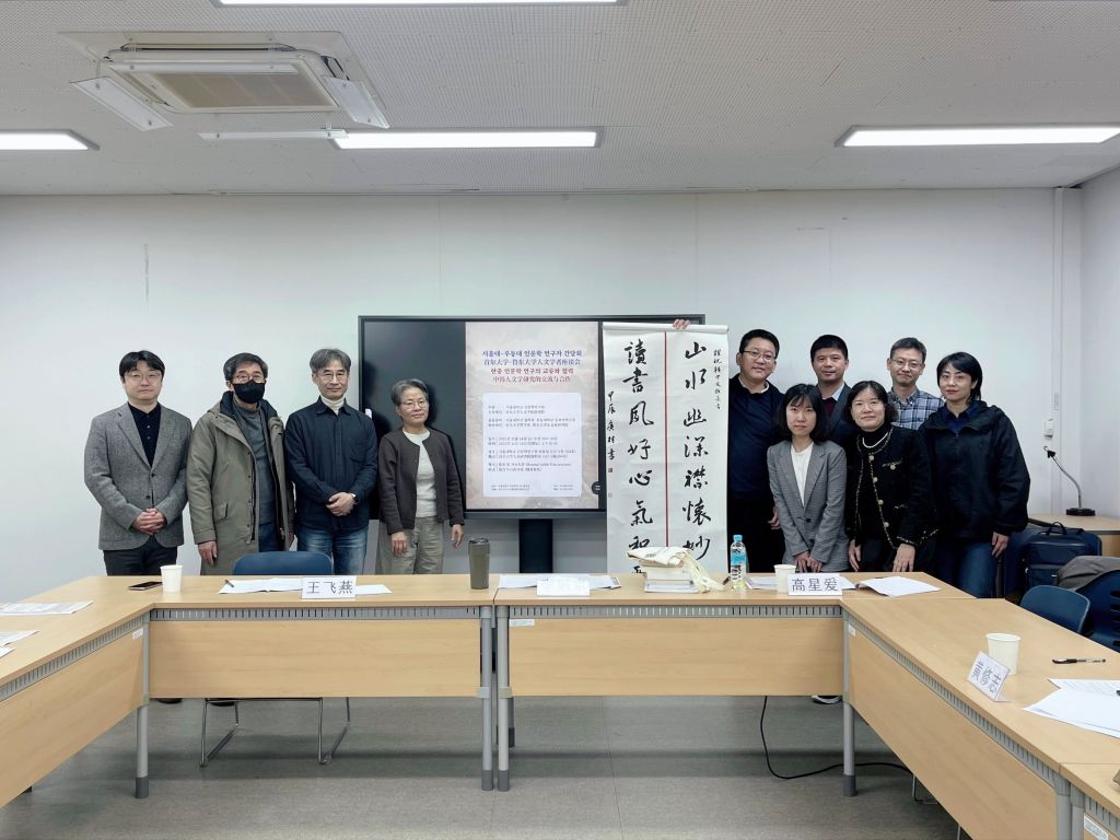 在首尔大学,团队与该校人文研究院联合举行“中韩人文学研究的交流与合作”工作坊。团队成员王飞燕、黄修志、高星爱、冯芒、孙蕴、张广村分别发表涵盖东亚文学、史学、儒学、文献学、艺术学等多元主题的研究报告,与首尔大学李惠京、丁垣在、洪宗郁、金圣洙等教授展开深入对话。