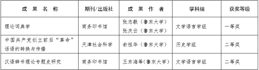 日前,山东省人民政府发布《山东省人民政府关于表彰山东省第三十七届社会科学优秀成果奖获奖成果和第十七届社会科学突出贡献奖、学科新秀奖获奖人员的通报》,人文学院共有3项申报成果荣获表彰,其中,张志毅、张庆云教授的著作《理论词典学》荣获一等奖,俞祖华教授的论文《中国共产党创立前后“革命”话语的转换与传播》、王东海教授等的著作《汉语辞书理论专题史研究》荣获二等奖,取得获奖等级与数量的双重突破。