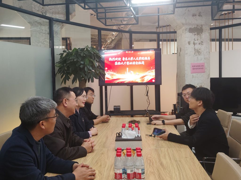 在大千影业,于龙杰一行与公司创始人、鲁东大学2007级校友赵林林及核心管理团队进行了充分交流。赵林林详细介绍了大千影业从传统综艺后期制作公司向全链条内容生产平台转型的历程,重点展示了企业在纪实类综艺、文化纪录片、短视频IP孵化等领域的代表性作品。赵林林带领参观了公司的创意研发中心与后期剪辑机房,现场演示了节目的全流程制作体系,结合行业趋势分析了综艺内容生产的人才需求变化,强调“共情能力”“文化解读力”与“快速学习能力”是人文类专业学生的核心竞争优势,建议学院在人才培养中强化项目制实训,缩短学生从课堂到职场的适应周期。于龙杰在交流中介绍了人文学院近年来在课程体系优化、实践教学强化方面的改革举措,特别是数字人文、文化传播等模块课程建设情况。双方就“校企合作项目”进行了深入探讨交流。