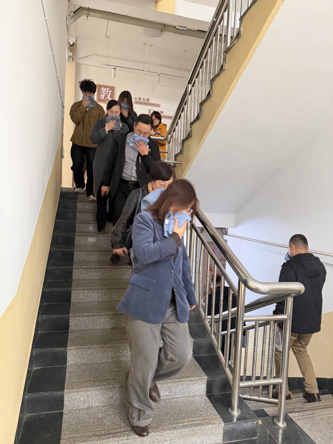 随着模拟火情警报响起,应急逃生演练正式开始。全体师生严格按照演练要求,用湿毛巾捂住口鼻,弯腰低姿、紧贴墙体,沿指定疏散路线快速、有序撤离至安全集合区域。各小组迅速清点人数,上报现场情况,整个演练过程组织严密、分工明确、紧张高效,达到了预期效果。