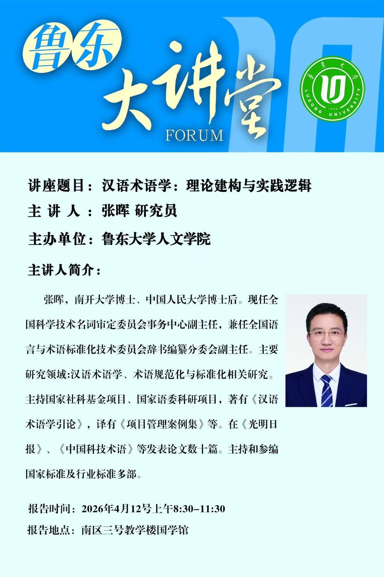 鲁东大讲堂|张晖:汉语术语学:理论建构与实践逻辑【2026年4月12日8:30—11:30】地点:南三教学楼3楼国学馆