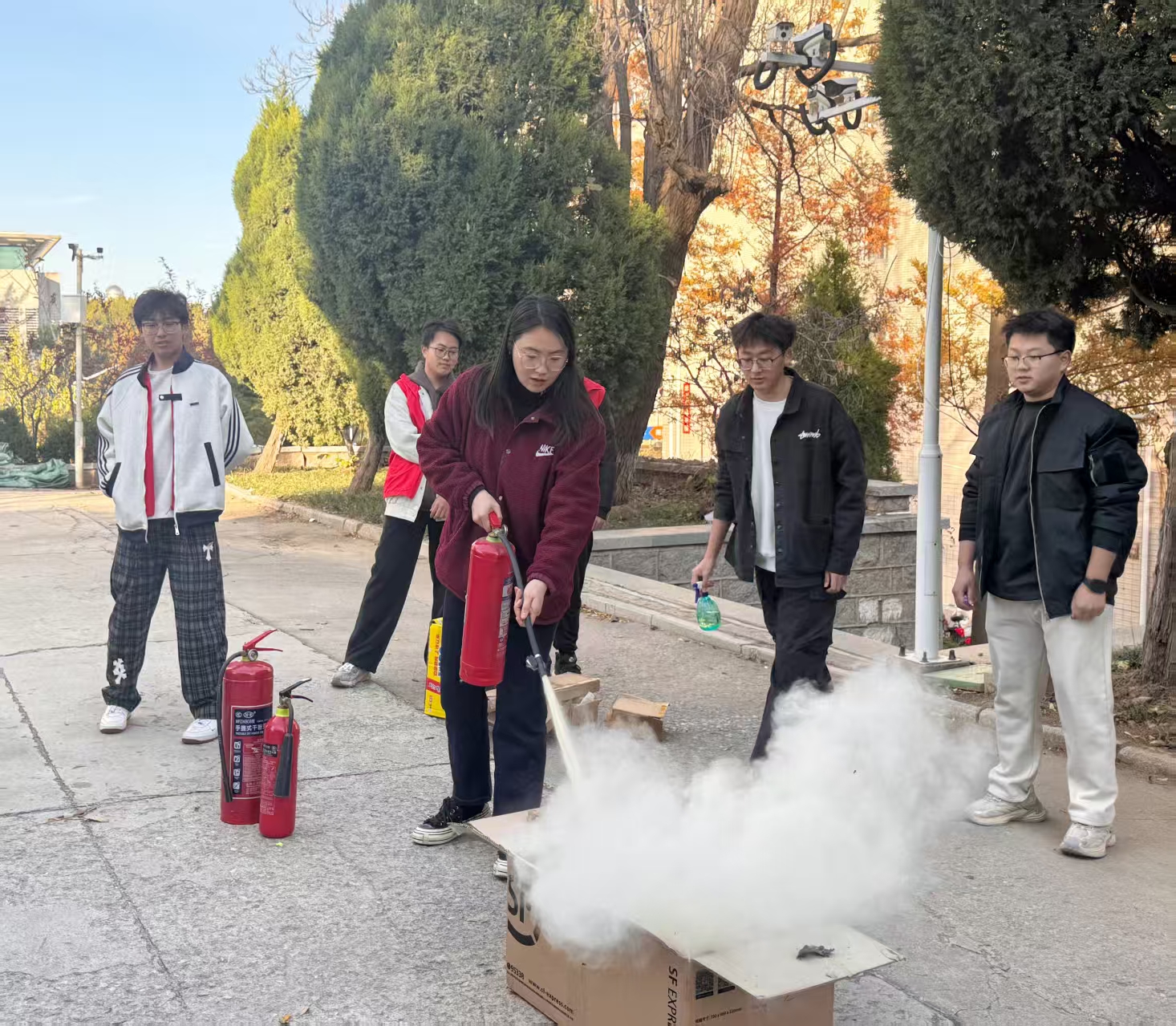 11月10日,公寓消防演练及灭火器演示活动在南二、南四学生公寓区开展。活动现场,公寓楼周边清晰张贴疏散指示标识,空地处搭建模拟火源点,并配备专业灭火器材。