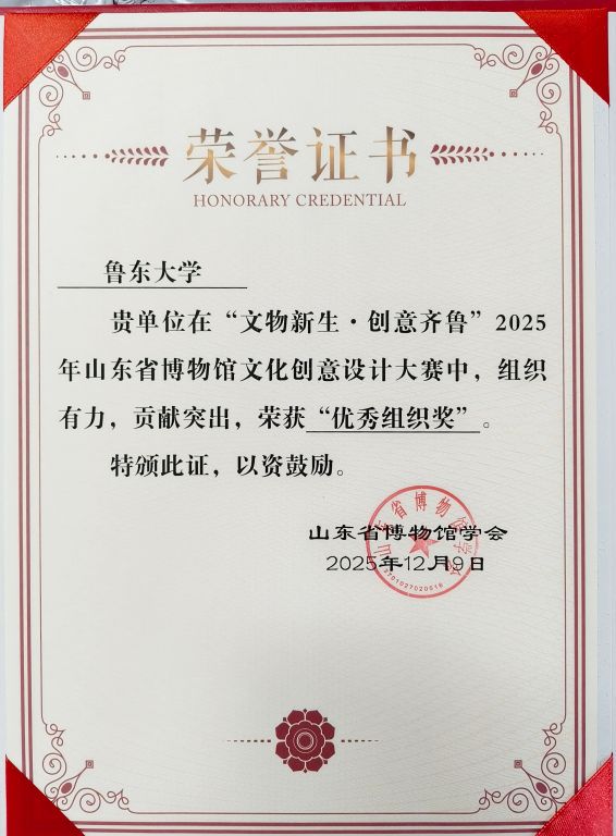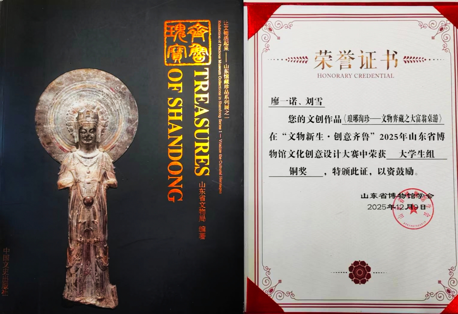 “文物新生·创意齐鲁”2025年山东省博物馆文化创意设计大赛由山东省博物馆学会主办,共征集作品600余件,经过评审共产生获奖作品83件。此次活动的获奖,不仅是学院学子创新能力和专业水平的集中展示,也是学院长期坚持文化育人、推动通识教育与专业实践深度融合的成果体现。